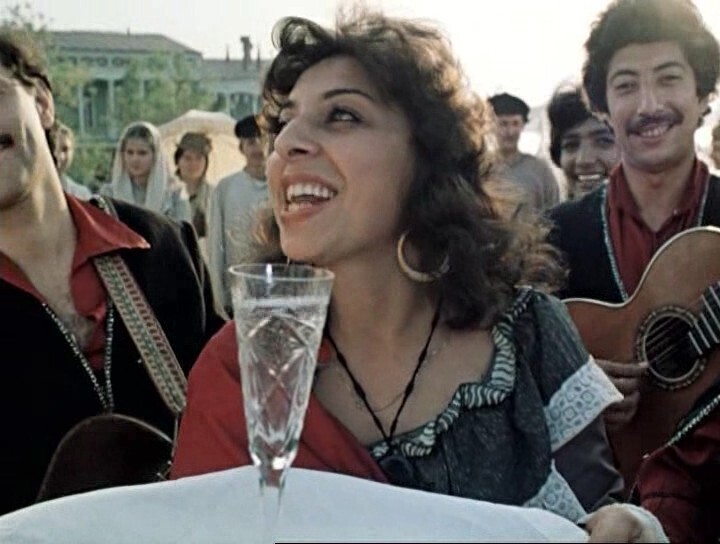 В конце первого фильма Паратов возвращается и его радостно встречают цыгане с песнями и танцами. Цыганка носит крупные серьги-кольца и они ей очень идут. На груди у певицы я заметила тонкую цепочку и медальон на чёрном шнурке.