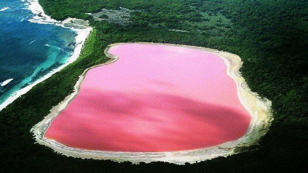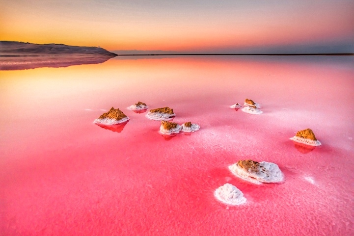 В зависимости от освещения вода в озере меняет цвет:от нежно-розового близко к белому,сладко-лилового до густо-пурпурного, коричневого, фиолетового ,сливового и даже красного.