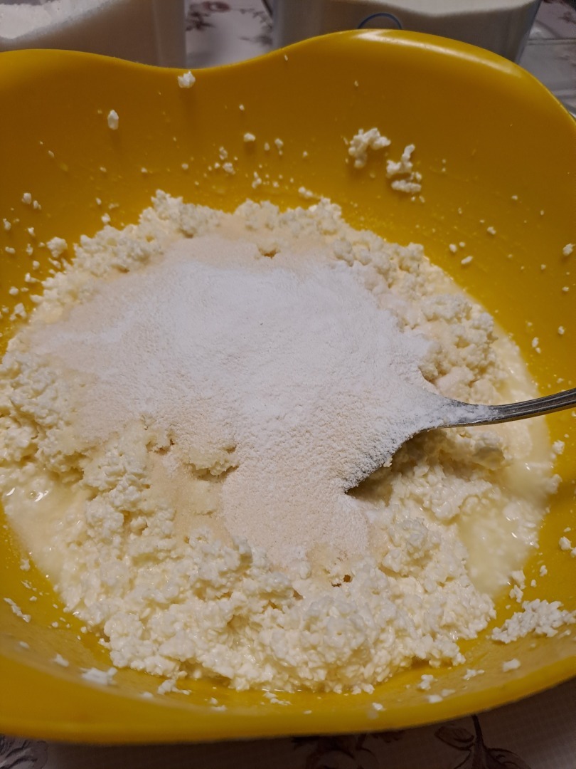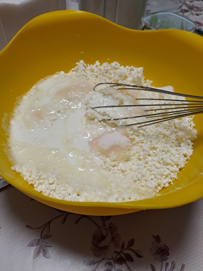 Добавляем яйца к творогу, добавляем сметану, ванильный сахар, разрыхлитель. Перемешиваем.