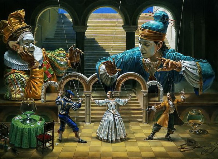 Он есть грандиозный Сценарист, а мы актёры. Есть же актёры, которые снимаются в фильмах. Кто-то злой, кто добрый. Там по-нарошку, а здесь-по настоящему. Злые силы поднебесные и светлые ставят ставки свои. Кто-то несёт зло на земле. Это они поставили на него фишку свою. Воспитывают его, дают ему соответствующие мысли, желания, чувства. Такой человек привлекает к себе людей на сотворение зла на земле. Вспомним А.Гитлера. Многие поражены были его речами, были действенны его методы борьбы со злом. Идеология фашизма обрела актуальность среди многих людей того времени. Но, была нарушена заповедь Христа о любви к ближнему. За несоблюдение этой заповеди Бог, как управитель чувств и ума людей, внушал мужество советским людям, подал им оружие более лучшее, которое смогли одолеть этого врага и уничтожить частично фашистскую идеологию.