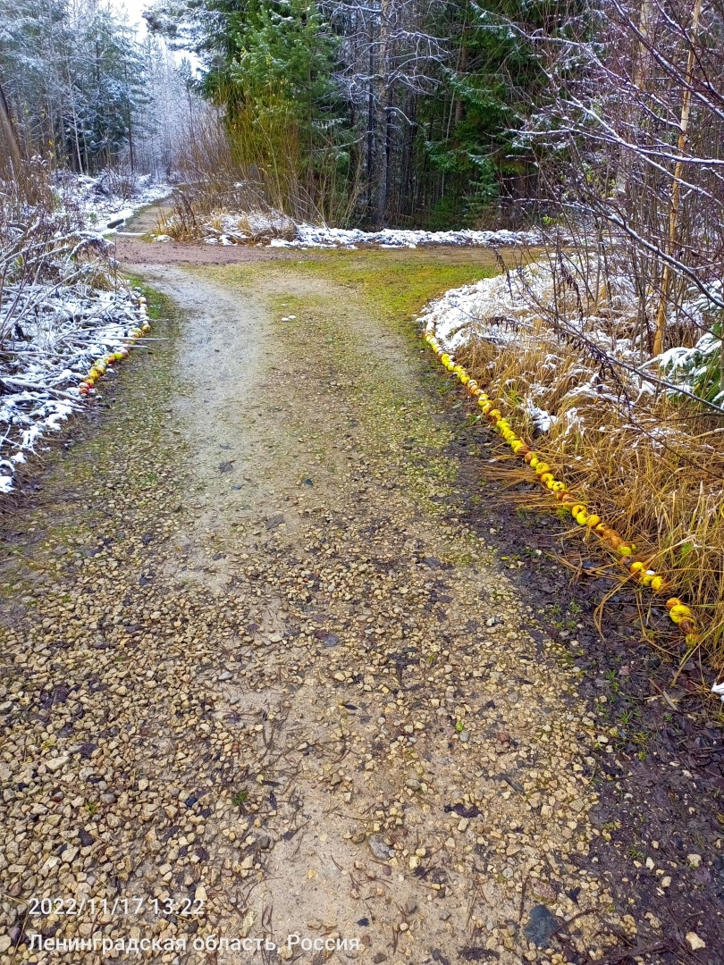 На дачной дороге какой-то чудик сделал на снегу ПОРЕБРИКИ ИЗ ЯБЛОК. Вчера не было. Садоводство Нева, массив Мшинское, Лужский район, Ленобласть