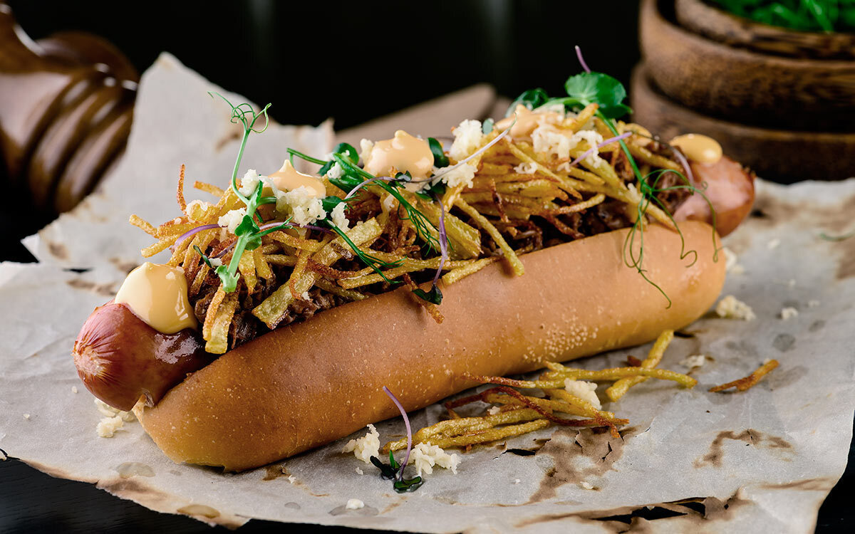 В составе столь дорогого фастфуда, конечно же, премиальные продукты: вместо обычной сосиски используют колбаску из японской говядины кобе, посыпанную белыми итальянскими трюфелями из Альбы и позолоченным перцем-горошком, а соус - на основе французского шампанского и шоколадной крошки. И все это, как говорится, на булочке с шафраном.