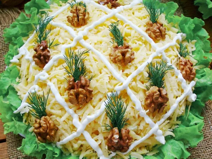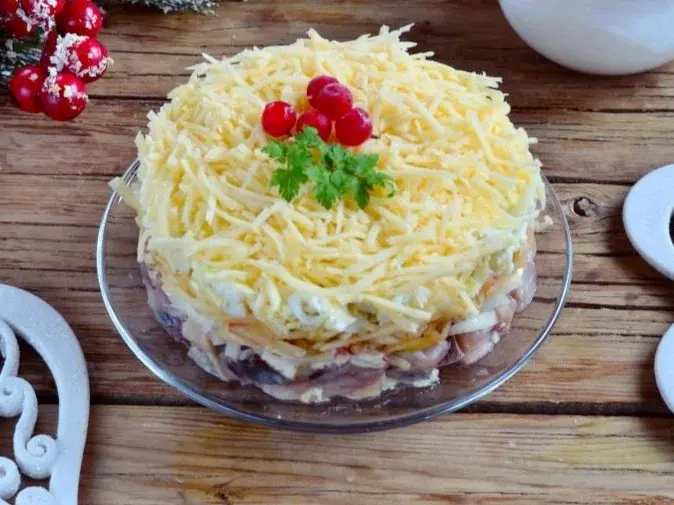 На небольшую тарелку поставить сервировочное кольцо. Собираем салат слоями: сельдь–лук–майонез–яблоко–майонез–яйца–майонез–сыр натертый на мелкой тёрке.