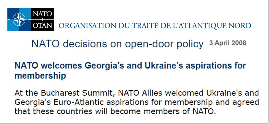 В то время как Россия только что умоляла о возобновлении партнерства с Западом в прошлом году, НАТО сделала еще один шаг к катастрофе, пообещав 3 апреля 2008 года Украине и Грузии, что они присоединятся к организации.