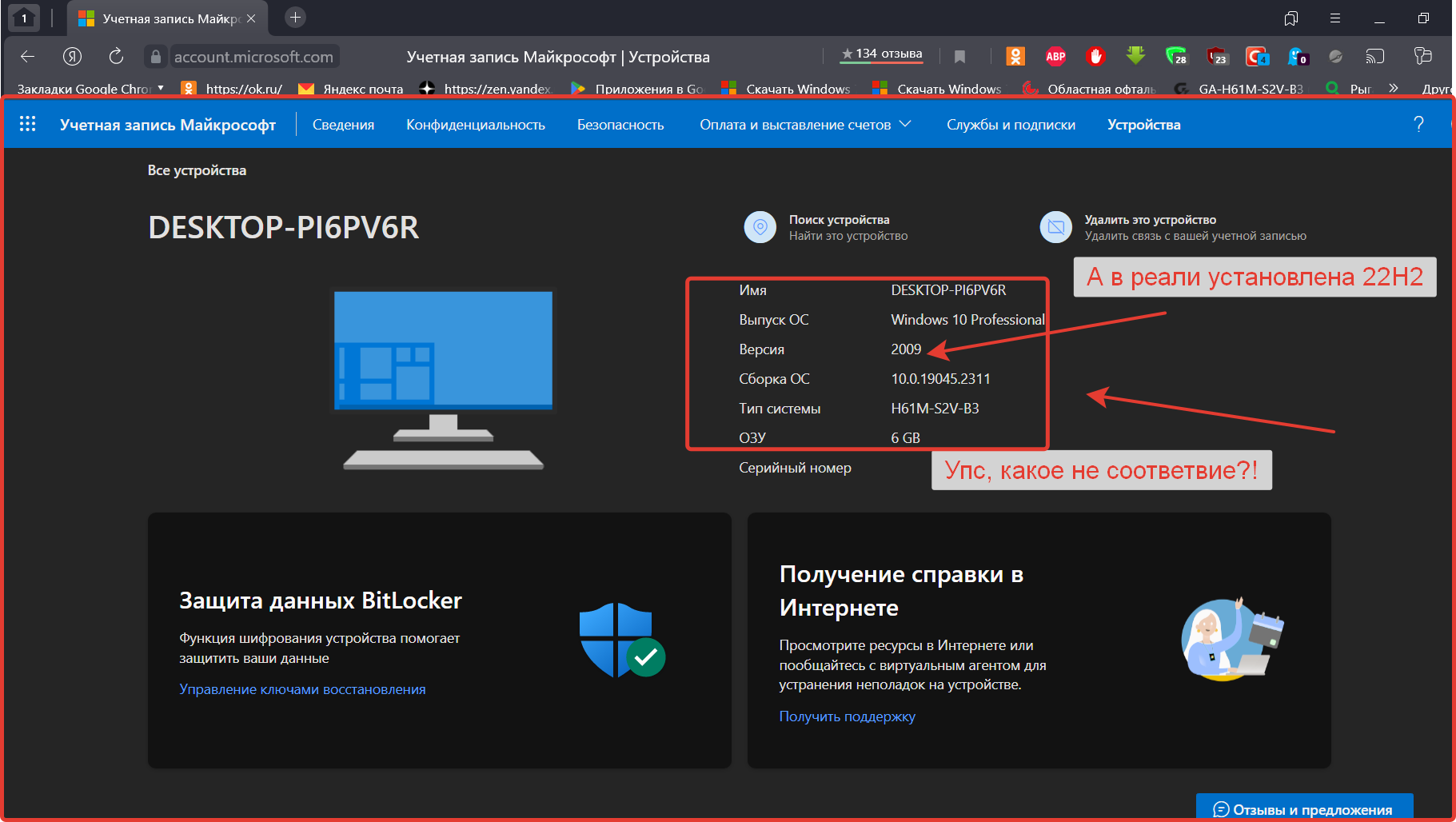 Войдя в свою учётную запись через поиск в панели задач, просто меня заинтересовало её расположение в редакции Windows 10 Pro. Продолжая проход дальше меня обратили в браузер. В моём случае браузер Яндекс, так как он является в ОС главным браузером по умолчанию. После входа на главную страницу от microsoft. Беглым взглядом оглянул её, прежде всего меня привлекло сведения. Насколько я понял сведения об установленной операционной системе, которой я пользуюсь в данное время. Ради интереса нажал на сведение, и меня перенаправили на следующую страницу. В которой меня дико удивило: описание о свойстве операционной системе. Оказывается по настоящему я пользуюсь не Windows 10 Pro 22H2, а 2009. Это получается по факту microsoft нас пользователей просто напросто обманывают?! Для наглядности я сделал скриншот в браузере Яндекс: