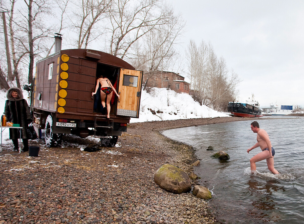 По сравнению с приведенными выше примерами, баня, установленная на кузове грузовика, не кажется чем-то необычным: услуги такой бани доступны круглый год и быстро набирают популярность среди любителей охоты и рыбалки.