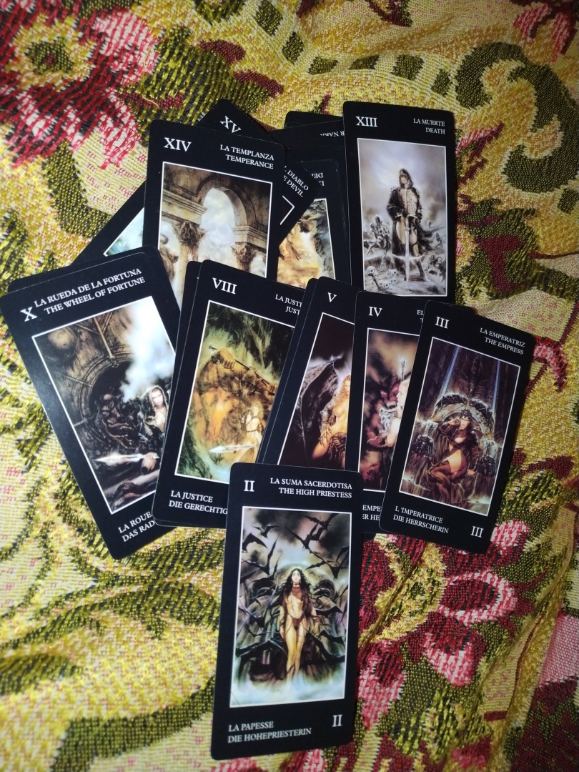 Если хотите чего-то тёмненького, обратите внмание на Тёмное и Чёрное таро Луиса Ройо. Это классические колоды, оформленные рисунками известного художника.