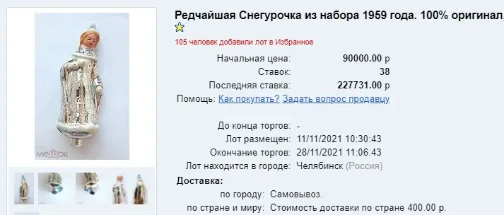 Редкая елочная стеклянная Снегурочка из одноименного набора, ушла с аукциона в ноябре 2021 года за 227 тыс. рублей. Вот так то. Смотрите, такая у Вас?