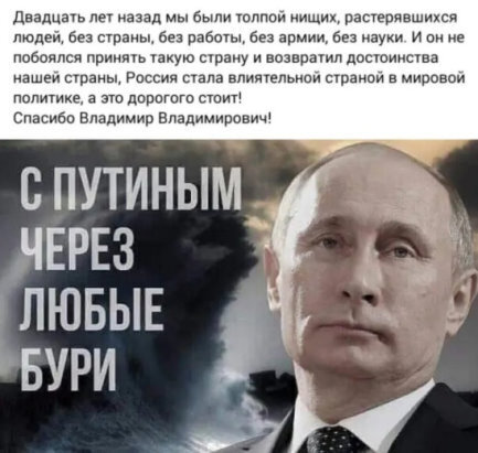 Бред не несите. Если бы не он , вообще не знаю , где бы мы были сейчас. Отмотайте время назад. Вспомните все , что было. Захотели жить как Запад , ну так никто не держит. Отправляйтесь туда , если сможете.