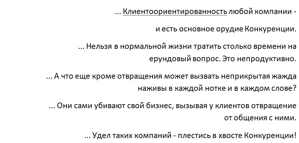 История очень печальная. Тем более, что мне представляется, что эта история повторяется изо дня в день в любом регионе России. "Бизнемены" сами убивают свой бизнес, вызывая у клиентов отвращение от общения с ними. А что еще кроме отвращения может вызвать неприкрытая жажда наживы в каждой нотке и в каждом слове? Пресловутая "клиентоориентированность" - только на словах, как и все модное. Об истинном значении этого слова никто из таких "бизнесменов" и не задумывался, видимо, никогда в прошлом, и не задумается, наверняка, никогда в будущем. А жаль. Ведь клиентоориентированность любой компании - и есть основное орудие Конкуренции. В условиях, когда рынки и торговые сети забиты одинаковым товаром, на первое место в инструментах успеха любого предприятия выступает она - клиентоориентированность. Сопутствующие сервисы, возможность быстро получить исчерпывающую информацию о товаре, удобное приложение в смартфоне... Это все - орудия производства для достижения успеха среди прочих равных условий.