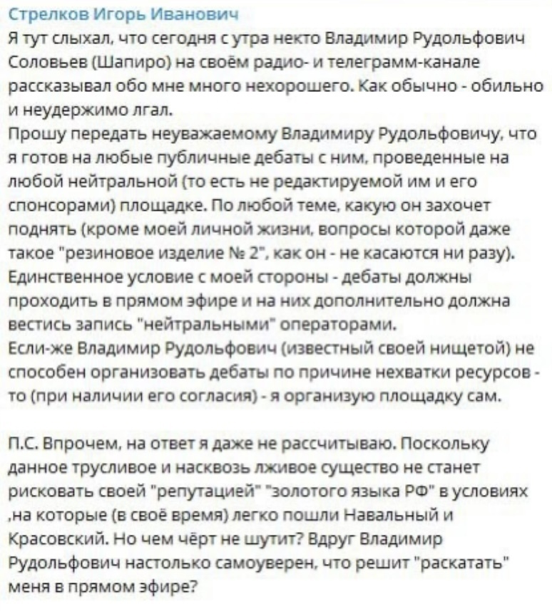 «Я тут слыхал, что сегодня с утра некто Владимир Рудольфович Соловьёв (Шапиро) на своём радио- и телеграмм-канале рассказывал обо мне много нехорошего. Как обычно – обильно и неудержимо лгал. Прошу передать неуважаемому Владимиру Рудольфовичу, что я готов на любые публичные дебаты с ним, проведенные на любой нейтральной (то есть не редактируемой им и его спонсорами) площадке. По любой теме, какую он захочет поднять (кроме моей личной жизни, вопросы которой даже такое „резиновое изделие №2“ как он, не касаются ни разу). Единственное условие с моей стороны – дебаты должны проходить в прямом эфире и на них дополнительно должна вестись запись «нейтральными» операторами»