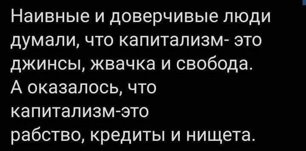 И вот ваша многолетняя надежда свершилась, желаемая демократия и капитализм и наступили. Вас отбросили назад, на 74 года, к капитализму, от которого избавились в 1917 году ваши деды. Россияне!!! Ваша алчность, жадность, непредсказуемая глупость и людское малодушие взяло верх. Вы все в 1991 году сразу захотели стать капиталистами, господами, а про рабов никто даже не подумал.