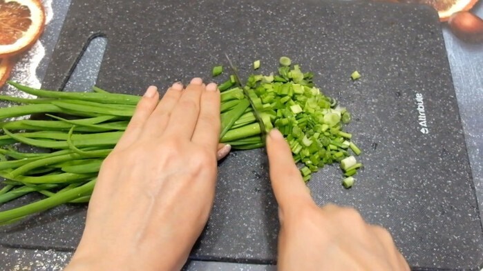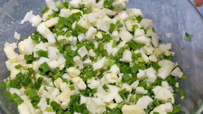 Отрезать белую часть от лука, измельчить зелень лука и яйца.