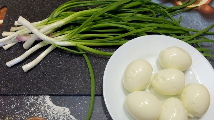 Для начинки:вареные яйца – 6 штук;большой пучок лука (100-150 грамм).