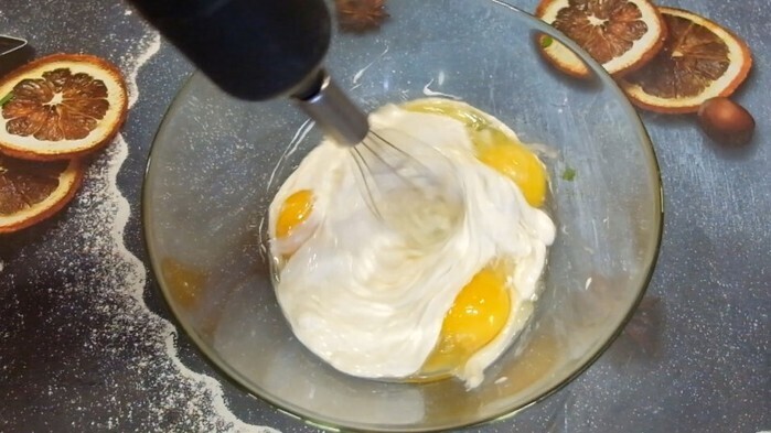 Для теста понадобится 3 яйца, 0,5 чайной ложки соли, 200 грамм сметаны, все перемешать.