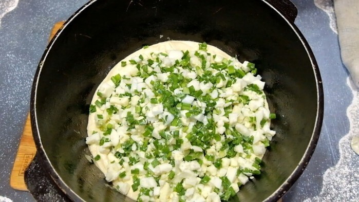 В разогретую и смазанную маслом форму выложить половину теста. Сделать углубление для начинки, оттягивая тесто на края. Желательно, чтобы начинка как можно меньше соприкасалась с формой, чтобы лук не подгорел, а яйца не стали твердыми.