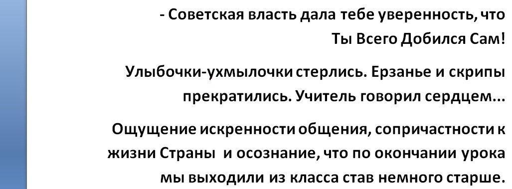 Надо сказать, что "к теме урока" мы тогда и не приступили, а все 45 минут школьного часа проговорили о Родине. Но это и был Настоящий урок. Я не буду пересказывать, о чем конкретно мы тогда говорили. Да и за давностью лет детали того памятного разговора давно уже стерлись. Осталось лишь ощущение искренности общения, сопричастности к жизни Страны и осознание, что по окончании урока мы выходили из класса, став немного старше.