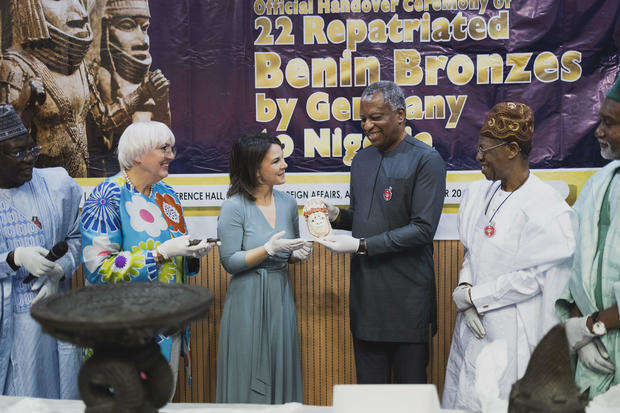 "Сегодня мы собрались здесь, чтобы вернуть бенинские бронзы туда, где они принадлежат: народу Нигерии", - заявила министр иностранных дел Германии Анналена Бербок во время официальной церемонии передачи первых 22 бронзовых наград.