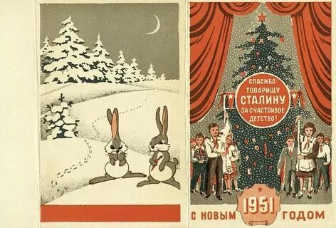 Новогодние открытки в СССР, как часть праздничного ритуала, два зайца и товарищ Сталин