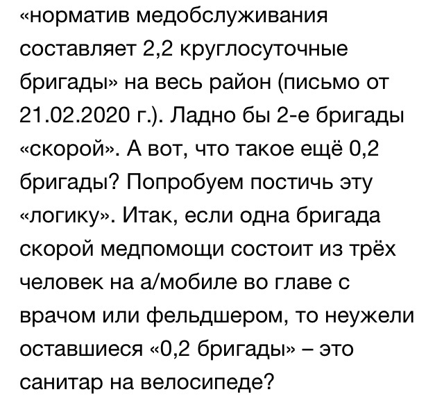 Но пришёл 2018 год, и районные власти решили, что как-то до хрена (извините за выражение) круглосуточной медицинской помощи населению оказывается. По их нормативам одна бригада скорой помощи должна обслуживать 10 000 населения, в районе примерно 23 000, в районном центре станция скорой помощи есть. Значит, на всех остальных можно экономить.