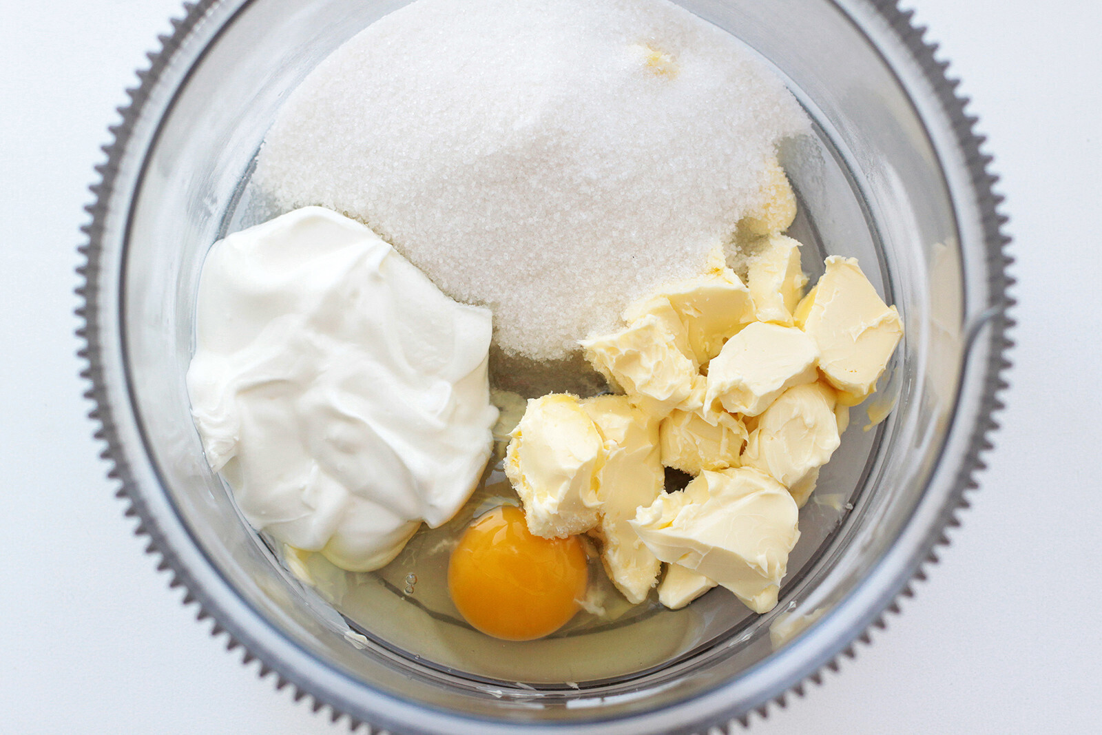 1. Для песочного теста положите размягченное сливочное масло, яйцо, сметану, сахар и соль в большую миску - все ингредиенты должны быть комнатной температуры.