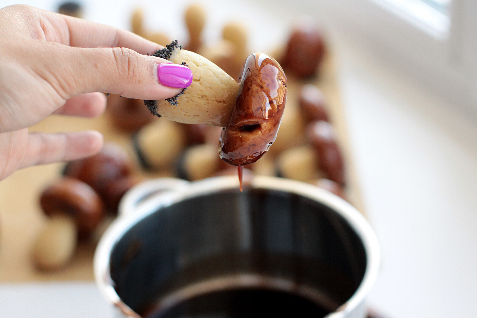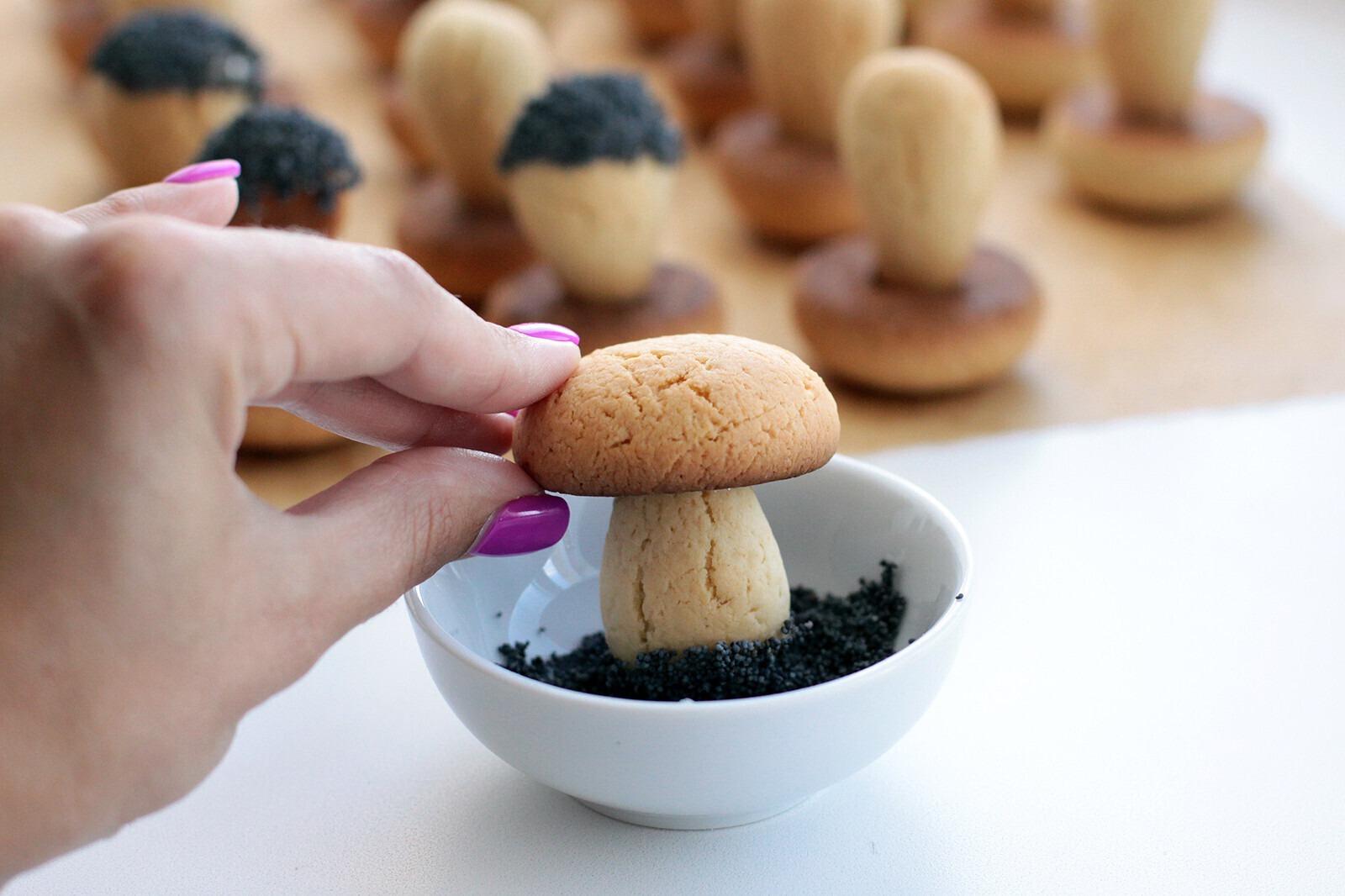 12. Теперь приготовьте блюдце с маком, окуните в сироп нижнюю часть грибных ножек, а затем покройте маком – это создает эффект “земли” на грибных ножках.