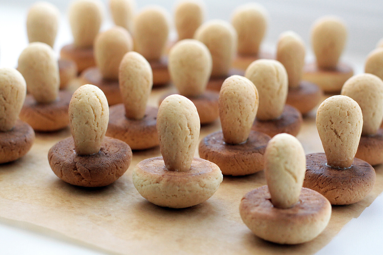 7. Теперь займитесь второй частью теста: сформуйте из него столько же стеблей, сколько и шляпок, и выложите на лист.