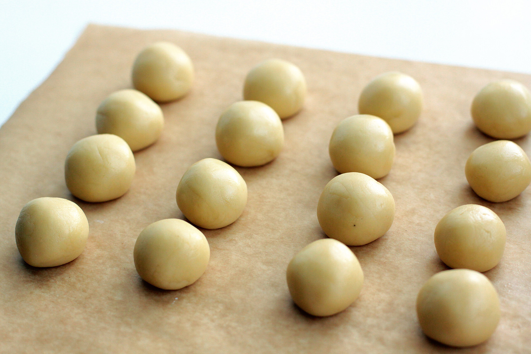 4. После этого разделите тесто пополам и начните работать с первым куском – этого будет достаточно для грибных “шляпок”. Руками, посыпанными мукой, и ножом разделите тесто на 20-22 равные части. Округлите их и выложите на подготовленный противень, застеленный листом пергамента.