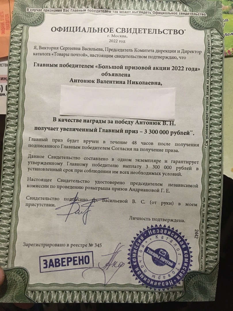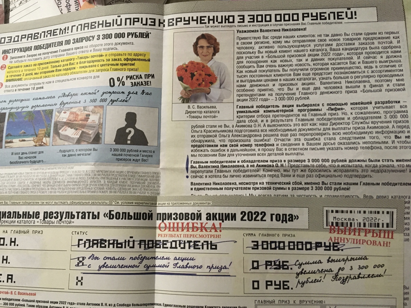 Так подробно пишу для тех, кто, полагаясь на русский «авось», всё-таки попытается поймать Жар-птицу за хвост. Не поймаете. Вместо выигрыша придет очередное письмо, а вместо телевизора – фоторамка 7*10. Короче, заплатите за разбитое корыто.