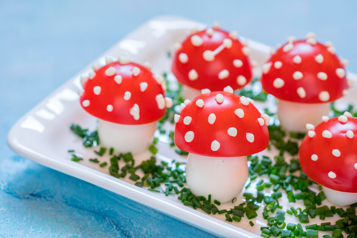 7. Помидор с майонезом - идеальный мухомор. Вы можете украсить свой салат Оливье таким веселым способом, чтобы порадовать своих друзей и близких.