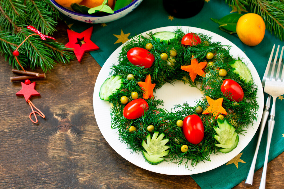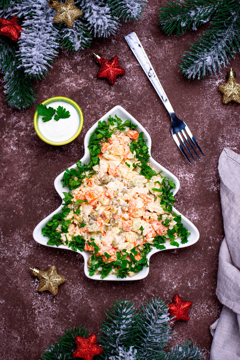 11. Также можно выложить салат Оливье на плоскую круглую тарелку в виде рождественского венка, обильно посыпать зеленью и украсить яркими овощами.