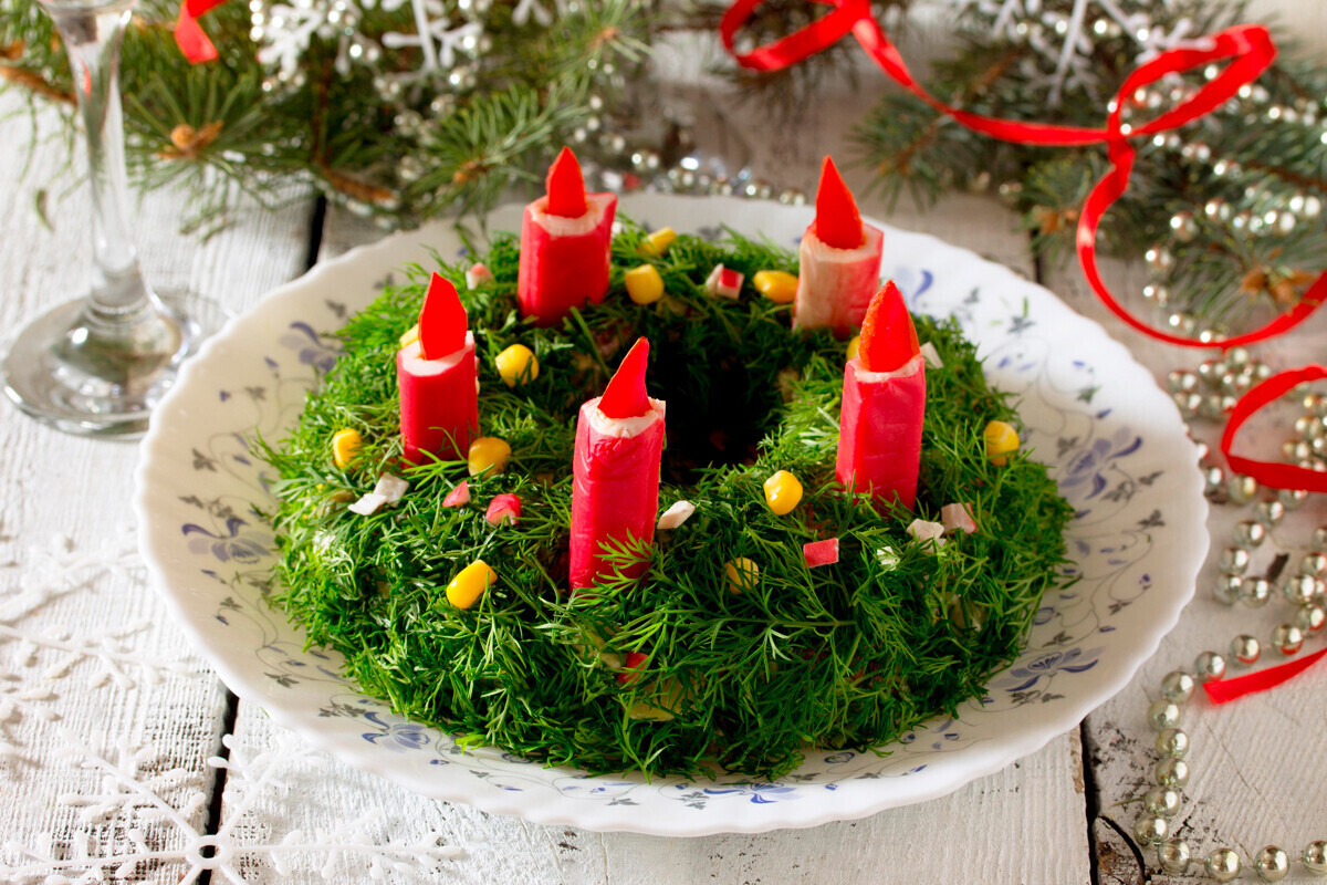 3. Крабовые палочки выглядят как свечи! Вы можете сделать это, чтобы украсить крабовый салат в виде венка.