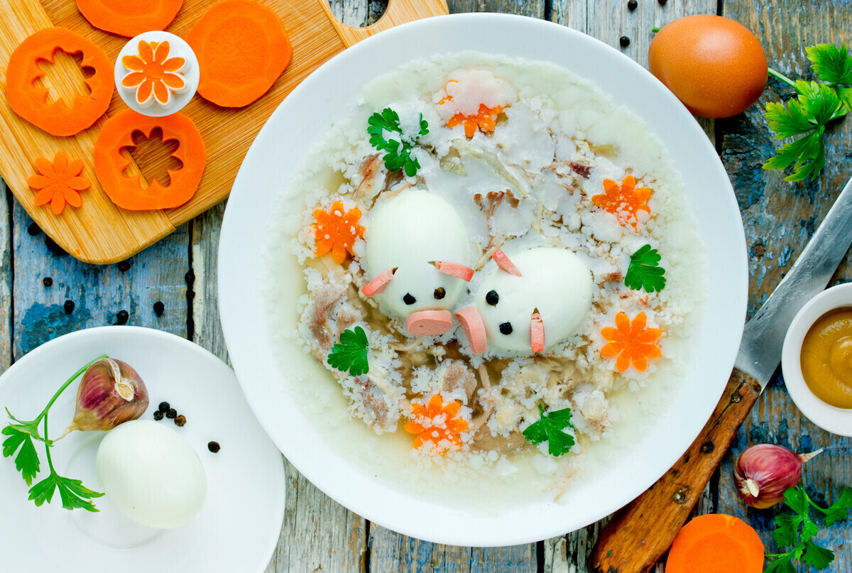 12. Заливное также может выглядеть празднично, если вы используете резные овощи и животных, сделанных из яиц.