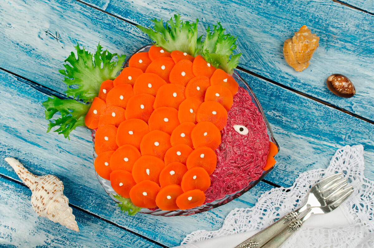 9. Это еще один недорогой вариант украшения салата с сельдью. Однако трудно сразу сказать, что это за салат. Из ломтиков моркови получается вполне реалистичная рыбья чешуя.