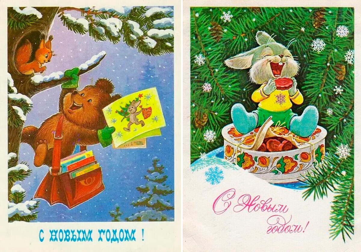 Подарки готовили заранее, хотя у советских людей не было большого выбора; популярными вариантами были даже банка домашних огурцов или палка вяленой колбасы. Иногда поздравления просто передавались через новогоднюю открытку: классические советские открытки изображали милых животных в заснеженных лесах.