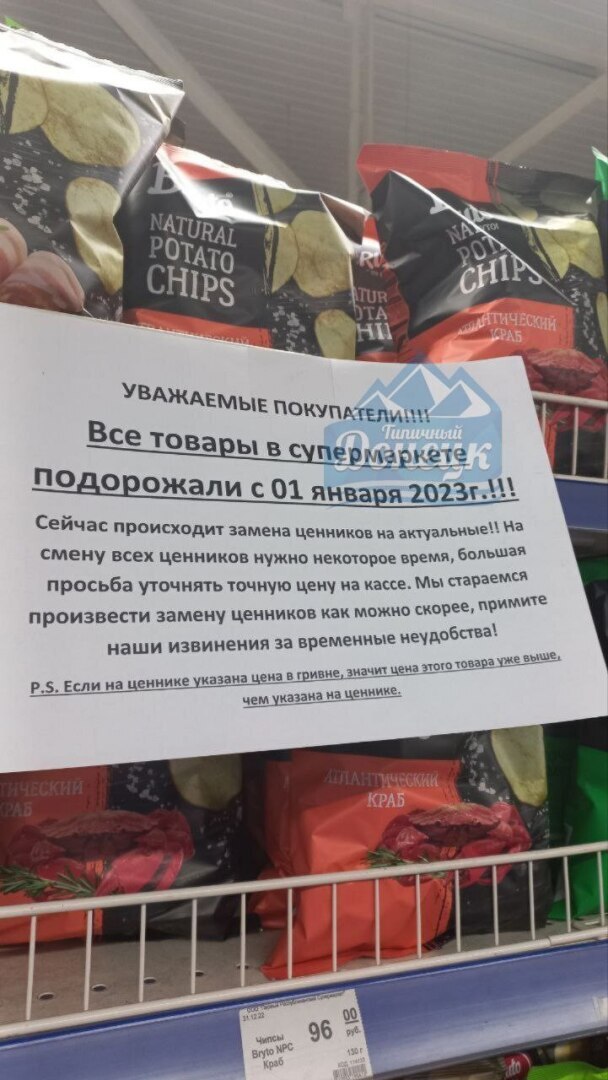 В магазинах ДНР и вовсе появились вот такие объявления о том, что цены изменились, но далеко не все успели установить новые ценники. В целом известно , что цены в новых регионах России повысились на 20%. Мне вот интересно , а других регионах России тоже выросла цена на товары и если да, то на какие. Напишите в комментариях если не сложно, а что у вас успело подорожать с первого января.