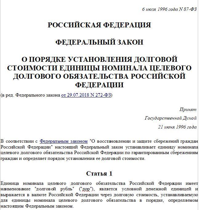 ФЗ-87 от 06.07.1996 года,- прямым текстом о стоимости рубля Российской Федерации. Кому, чего и сколько полагается по закону (87-ФЗ). Почему не дают и как это получить?