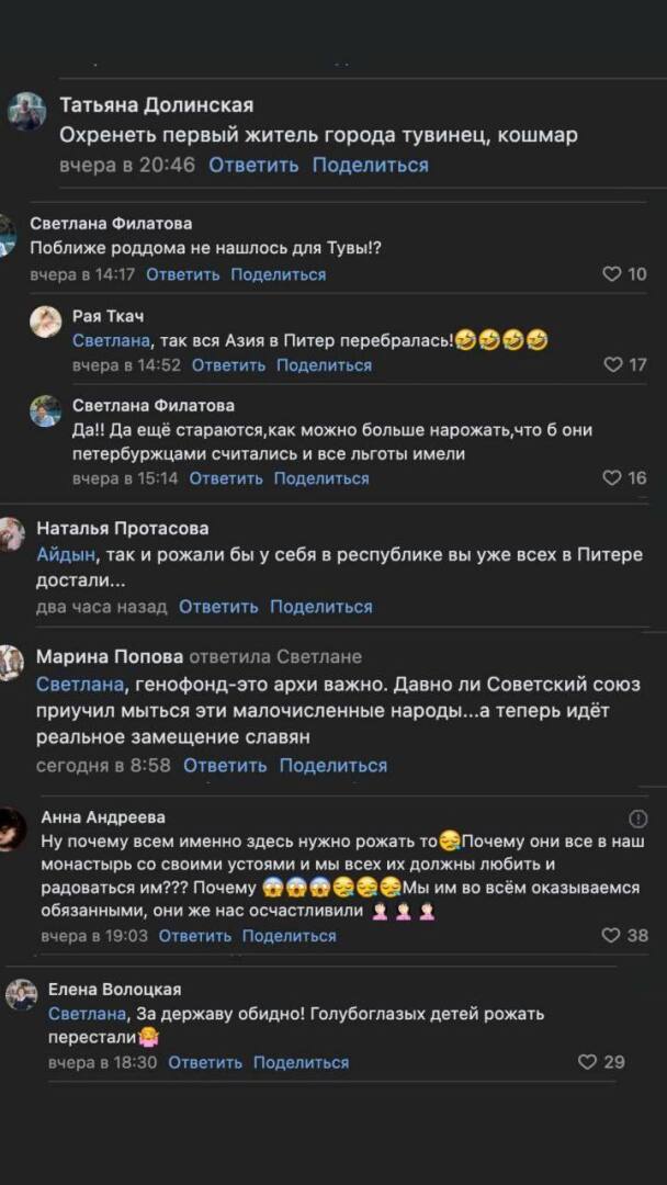 Ахреневшие, кто им не дает идти и рожать, всех этих писак надо бы привлечь за разжигание межнациональной розни. Может питерцы вспомнят, что не только они освобождали их город, а и те же тувинцы.