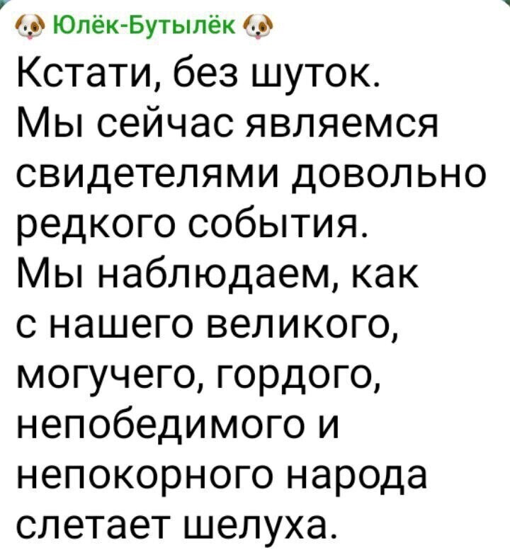 На 100%согласна с автором.настоящие люди сейчас сражаются за Родину, а ублюдки и подлецы за сытую жизнь...перечитайте А.Гайдара Военную тайну, Смолянинов вылитый Мальчиш-Плохиш!!! К сожалению, и в нашем обществе есть "потребители", а не патриоты России!