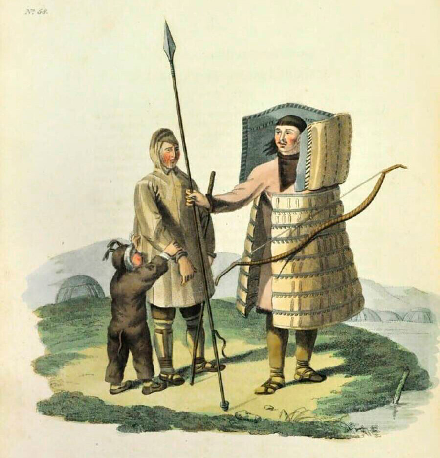 Чукчи не пользовались щитами, но их высокоразвитая ловкость помогала им уворачиваться от стрел своих извечных врагов, коряков (родственный коренной народ, живущий к югу от чукчей, который принял присягу России). Тем не менее, тела воинов были защищены с головы до колен пластинчатыми (пластинчатыми) доспехами, изготовленными из моржовой кожи, моржового бивня, ребер северного оленя, китового уса и/или железа.