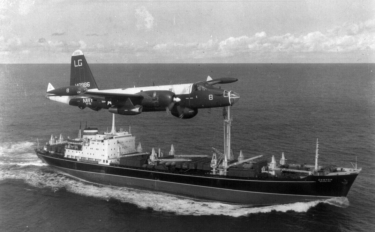 Американский патрульный самолет P2V Neptune пролетает над советским грузовым судном во время Карибского ракетного кризиса на этой фотографии 1962 года.