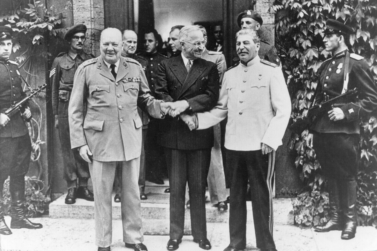 Слева направо: премьер-министр Великобритании Черчилль, президент США Гарри С. Трумэн, глава советского государства Иосиф Сталин.