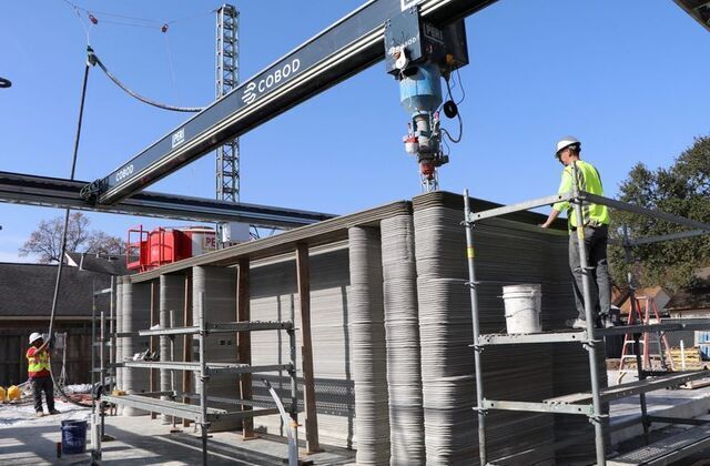 Огромный принтер весом более 12 тонн создает, как полагают, первый в США двухэтажный дом с 3D-печатью.