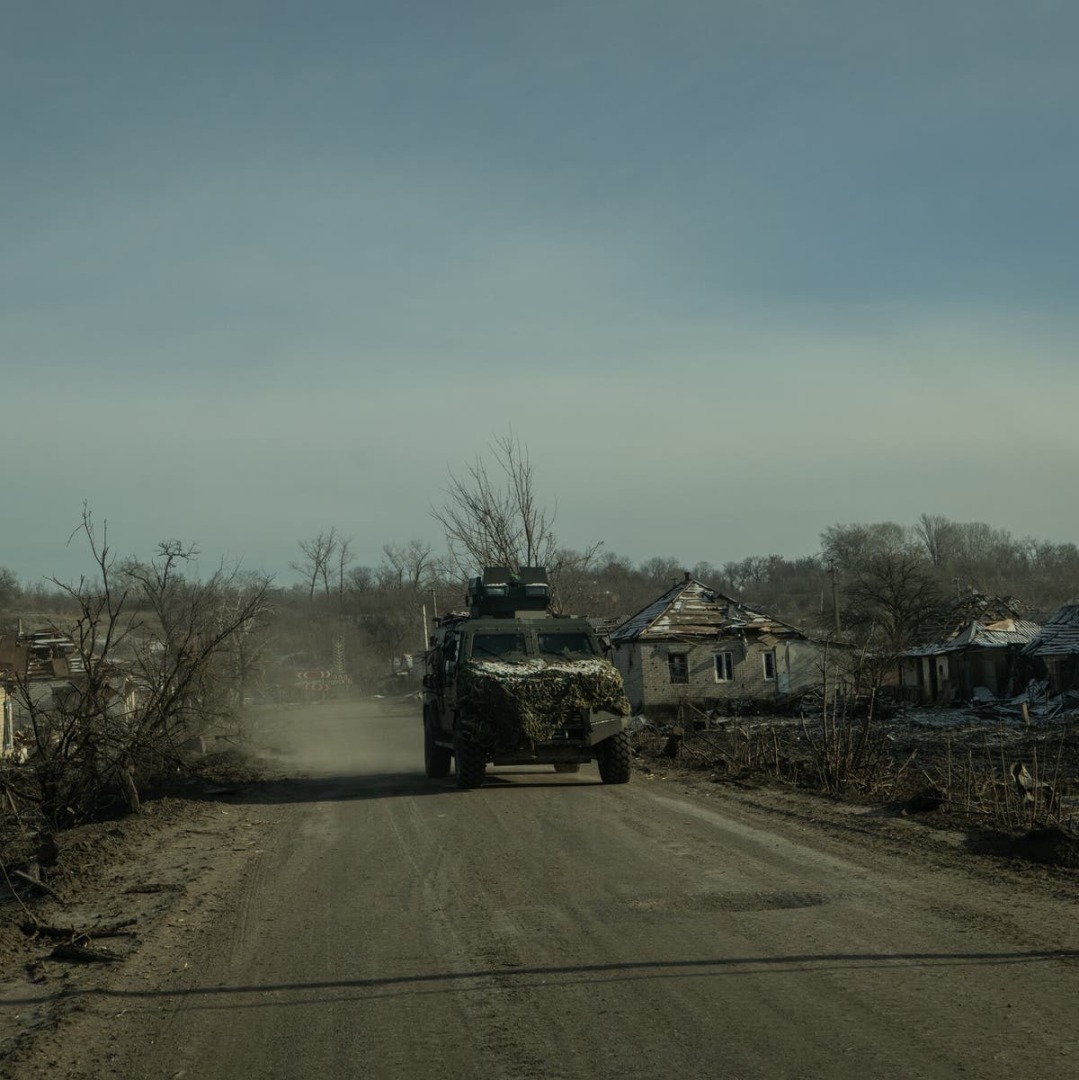 Украинская военная машина проезжает через разрушенное село возле прифронтового города Кременная Луганской области во вторник.Кредит...Николь Танг для The New York Times