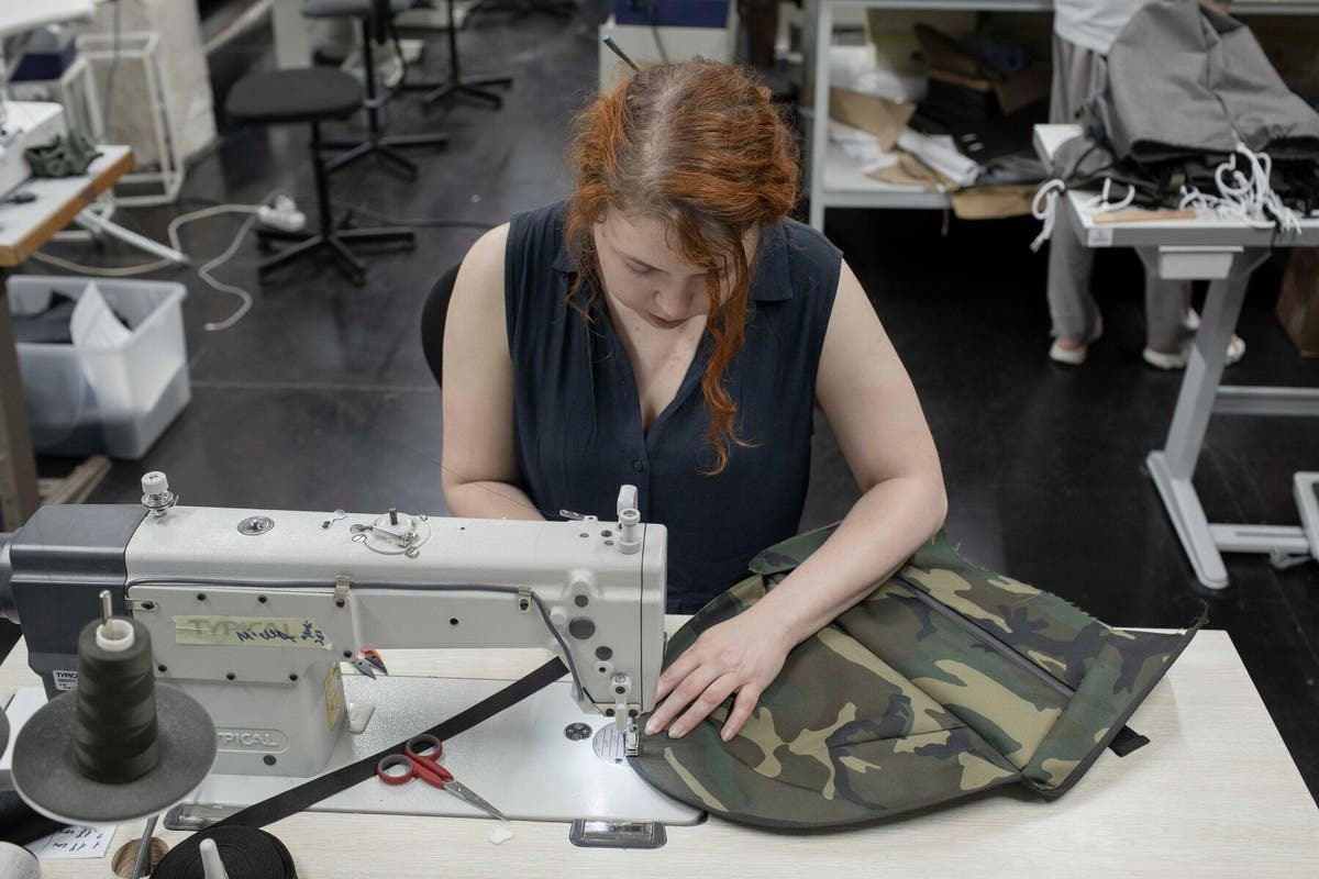 Теперь бронежилеты производятся на месте, а жилеты с пластинами — и спереди, и сзади — шьются из профессионально выглядящего цвета хаки, камуфляжа или негорючей ткани с «пиксельным рисунком». Эти жилеты снабжены карманами и подсумками для турникетов и всего остального, что необходимо солдату. Швейная работа могла бы быть и поаккуратнее, но многие женщины, особенно матери, имевшие наибольший опыт обращения с иголкой и ниткой, в начале войны уехали с детьми из Украины, поэтому в мастерских не хватает шустрого персонала.