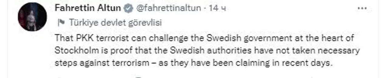 "То, что террористы РПК могут бросить вызов шведскому правительству в центре Стокгольма, является доказательством того, что шведские власти не предприняли необходимых шагов против терроризма", - добавил он.