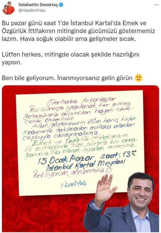 Бывший сопредседатель HDP Селахаттин Демирташ, который находится в тюрьме Эдирне, сделал примечательное сообщение на своей странице в социальной сети. Заявив, что в воскресенье в Картале (Стамбул) состоится митинг Альянса труда и свободы, Демирташ сказал: "Пожалуйста, все должны подготовиться, чтобы быть на митинге. Даже я иду. Если ты не веришь мне, приди и посмотри".