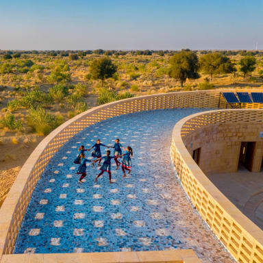 Проектирование комфортного учебного пространства может быть сложной задачей в самом сердце пустыни Тар, где изменение климата делает периоды засухи более продолжительными и интенсивными. Келлог, который обычно проектирует элитные жилые проекты, был мотивирован поездкой в Джайсалмер в 2014 году и хотел, чтобы здание символизировало надежду и стойкость пустыни, объединив аспекты традиционной архитектуры Джайсалмера с современным дизайном."Существуют методы охлаждения помещений, которые использовались веками. Что я сделал, так это соединил их в комбинацию, которая сработала ", - сказал Келлог, добавив, что температура в помещении школы примерно на 20-30 градусов по Фаренгейту ниже, чем на улице.