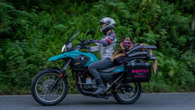 Не каждый день можно заметить мотоциклиста, едущего по дороге с немецкой овчаркой на заднем сиденье велосипеда.