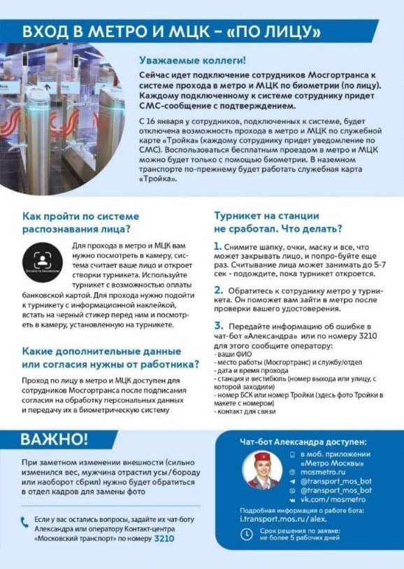Но не успели пройти новогодние праздники как "первые ласточки добровольности" не заставили себя ждать. Так в интернете распространяется информация, которую передали сотрудникам метро и один из них щедро поделился ей с людьми. Там сказано, что с 16 января бесплатный проход работников московского метро в это самое метро возможен будет только по биометрии. Мол хочешь пользоваться благами сотрудника метро, как бесплатный проезд сдавай свой фейс нам в пользование, а так плати денежки, даже если тебе по несколько раз надо пройти через турникеты, мол это никого не волнует. Всё только добровольно, как и обещали те кто принимал и подписывал закон об ЕБС. А как же, мы в России где свято чтят закон и данные обещания.